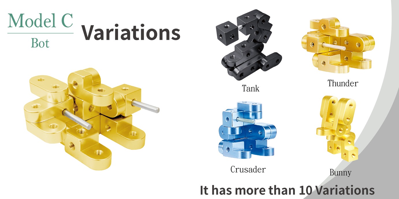10の異なる形のブロック。その側面にはネジ穴があり特殊なネジを使って接続します。