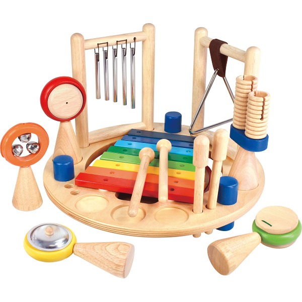 I'm toy メロディゴーラウンドは、子供たちに音楽を楽しむ喜びを与える知育玩具です。木製の丸い台座の上には、たいこやドラム、ベル、マラカスなどの音の出る楽器が配置されています。子供たちは自分のお気に入りの楽器を選び、楽しく音を奏でることができます。